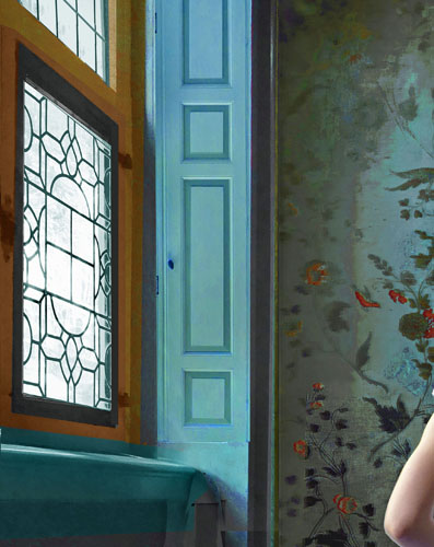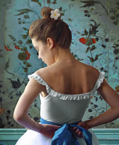 Eigen fotomontage met fotomodel Anouk in het balletkostuum van een Degas ballerina, het Vermeer-raam in mijn eigen atelier en het interieur van de Spiegelkamer in de Oude kerk in Amsterdam met origineel 18e eeuws handgeschilderd behang.