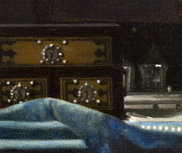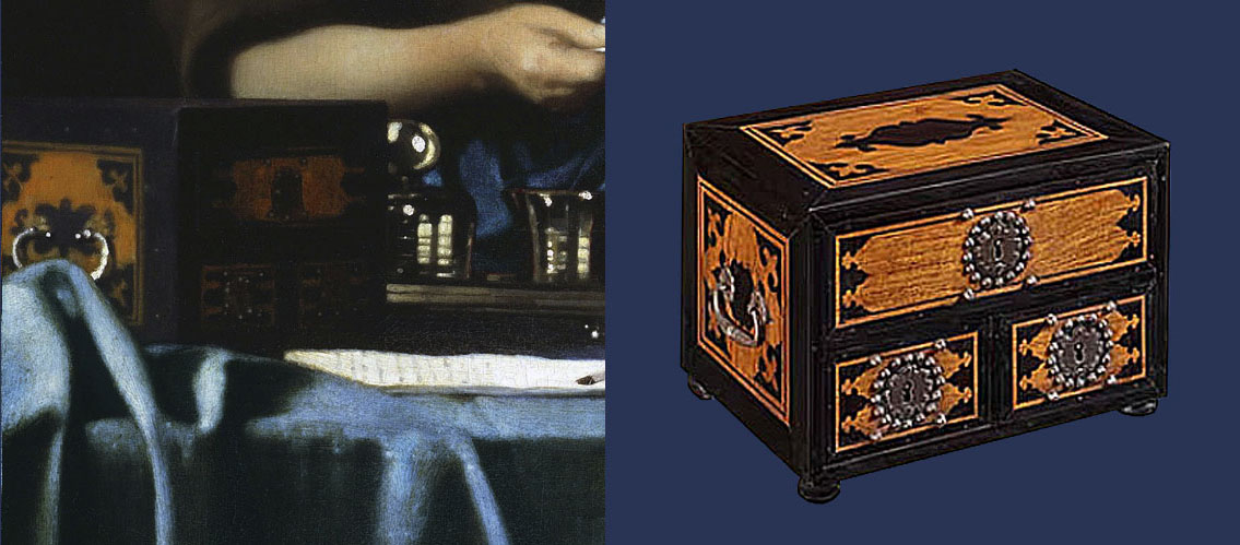 Dit soort juwelenkistjes moeten in het 17e eeuwse Holland erg kostbaar geweest zijn en het is welhaast niet voor te stellen dat Vermeer zich een dergelijk bezit kon veroorloven. Toch heeft hij een dergelijk juwelenkistje heel precies nageschilderd in twee schilderijen, wat betekent dat hij hoogstwaarschijnlijk wel degelijk een exemplaar in zijn atelier moet hebben gehad.