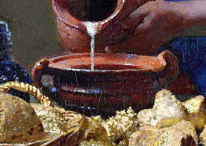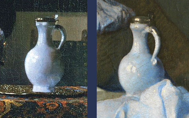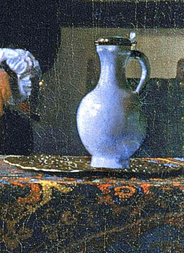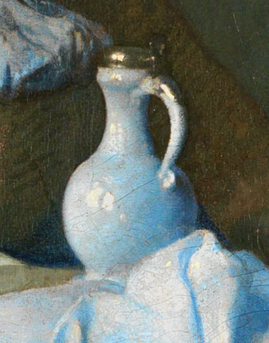 De witte wijnkan is misschien wel het Delftse “signature piece” van alle stillevenvoorwerpen in de schilderijen van Vermeer. De vermenging met het zuivere wit met het kostbare ultramarijnblauw is Vermeer’s in verf vertaalde ode aan het koele Hollandse daglicht.