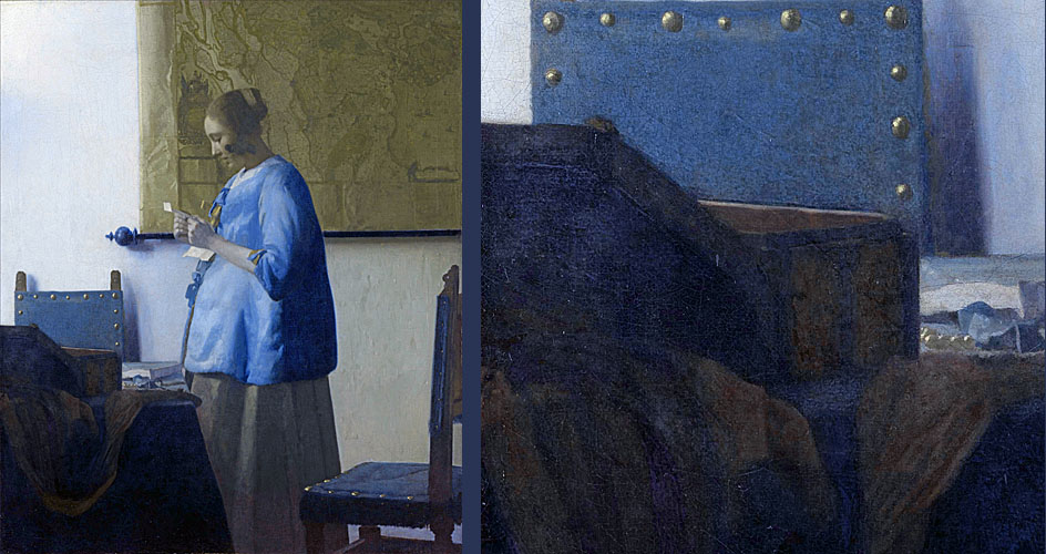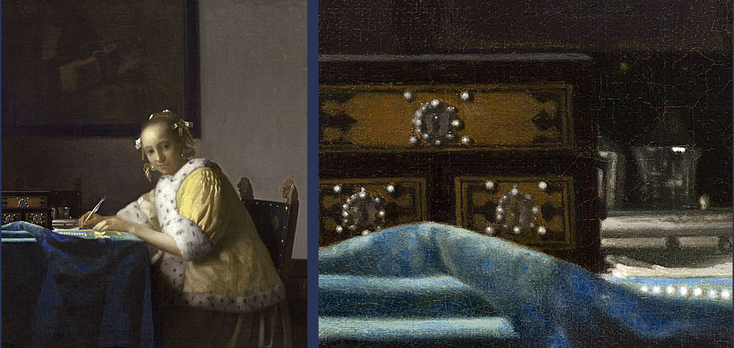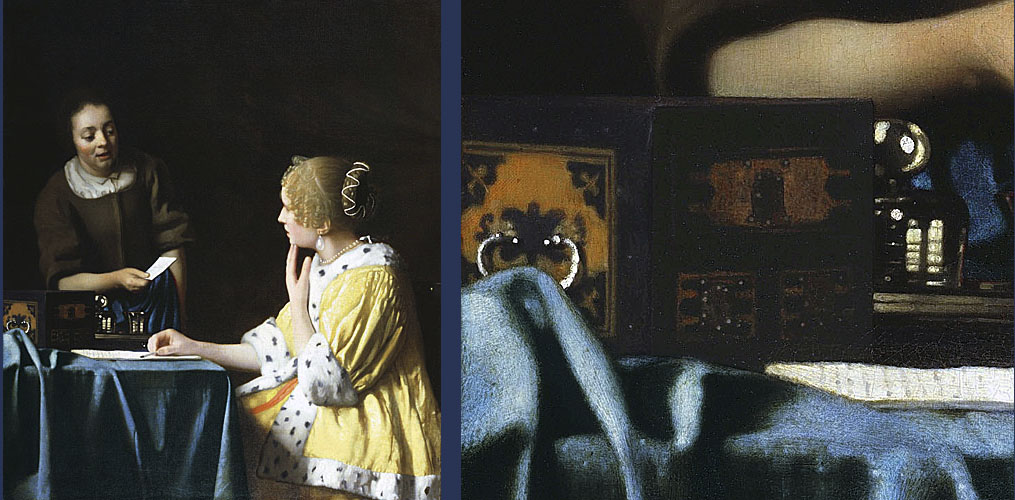 Dit zijn de twee Vermeer-schilderijen, waarop het Indo-Portugese juwelenkistje staat afgebeeld: “Mistress and Maid” uit de Frick Collection in New York en de “Lady Writing” uit de National Gallery in Washington. Het juwelenkistje in deze schilderijen was al eerder als Indo-Portugees geïdentificeerd, maar er blijkt nu dus nog een daadwerkelijk bestaand fysiek exemplaar ervan bewaard gebleven te zijn in een museum in Porto. Het kistje staat ook symbool voor de materiële rijkdom, die het herbergt. Het laat zien hoe zeer Aziatische luxegoederen uit het Verre Oosten waren doorgedrongen in het dagelijkse leven in woonhuizen in het 17e eeuwse Holland. Vermeer heeft het juwelen-kistje zo precies nageschilderd, dat hij daadwerkelijk een tastbaar exemplaar in zijn eigen atelier moet hebben gehad. Als kijker voel je de tastbare aanwezigheid van de dingen bij Vermeer, dat ze echt gezien zijn, precies zoals ze in het écht zijn. Niets is bedacht of slechts uit de herinnering geschilderd vanaf een schets, zoals bij velen van zijn tijdgenoten gebruikelijk was. Het is allemaal echt gezien. Bij Vermeer is niets onopgemerkt gebleven.