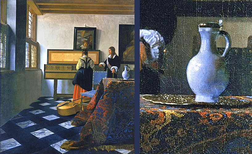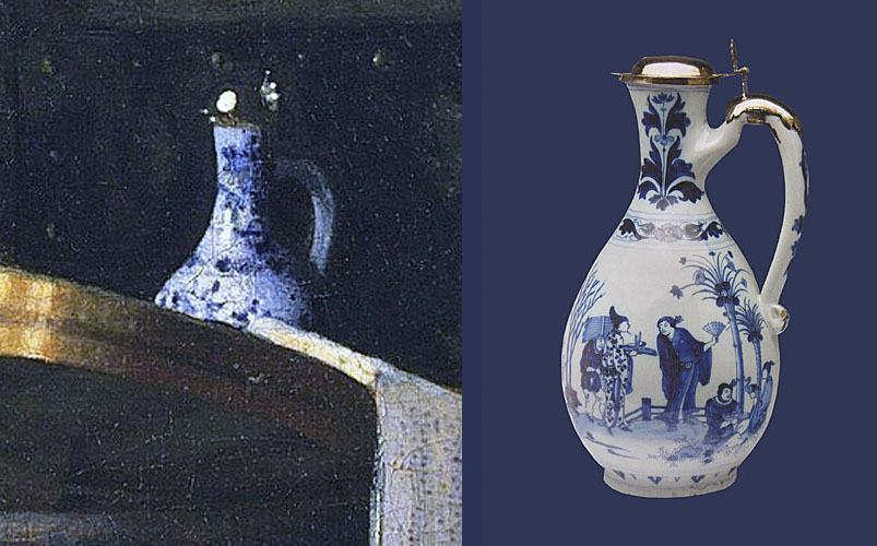 In Vermeer’s “Girl Interrupted at her Music” staat een blauw-witte wijnkan, die is geïdentificeerd als een Chinees exemplaar van overgangsporselein, geproduceerd tussen de Ming en Qing-dynastieën, ca. 1620-1683. Door de populariteit van het Chinese porselein in Holland, is het in Delftse ateliers nagemaakt als tinglazuuraardewerk, zoals de hierboven afgebeelde Delftse wijnkan uit het Atelier Het Jonge Moriaanshooft uit 1675.