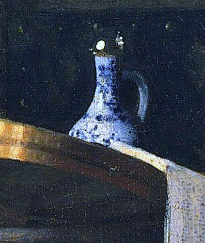 In het stilleven in Frick’s Girl Interrupted at her Music in New York, flonkert een blauw-witte wijnkan met zilveren deksel als een juweel. Vermeer weet als geen ander alledaagse voorwerpen te laten stralen en als een volwaardig personage in de afgebeelde scene boven zichzelf uit te tillen.