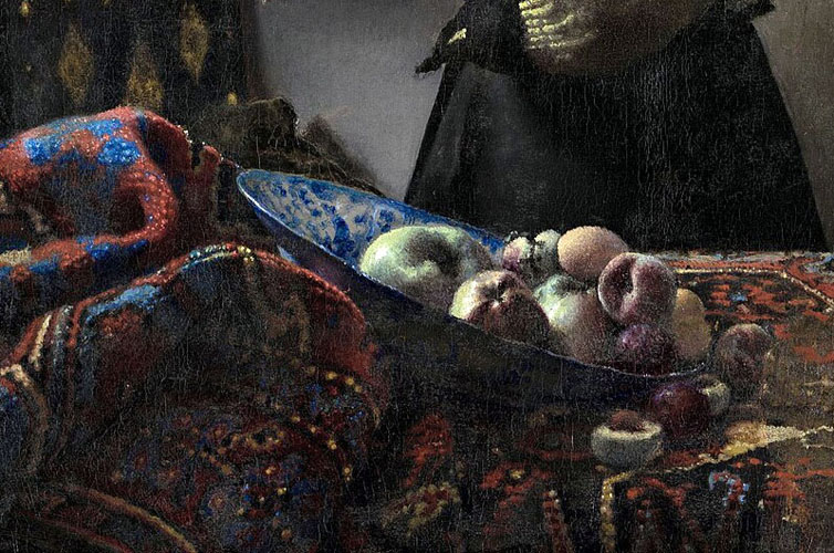 Origineel blauw wit Chinees porselein was een zeer kostbaar bezit in de 17e eeuw, die alleen de rijken zich konden veroorloven. Vermeer hield van het blauw in de blauw-witte porseleinen schaal, zoals in het stilleven van de schaal met appels en perzikken in de Briefleserin am Offenen Fenster in Dresden. Op het vroege “Girl Asleep”in New York is deze blauw-witte porseleinen schaal ook te zien in het stilleven op de tafel.