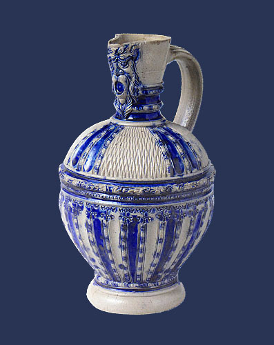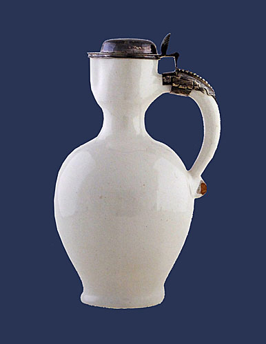 Wijnkan, fayence (tinglazuuraardewerk) en zilver (deksel), 1650, Delft, Museum Rotterdam.