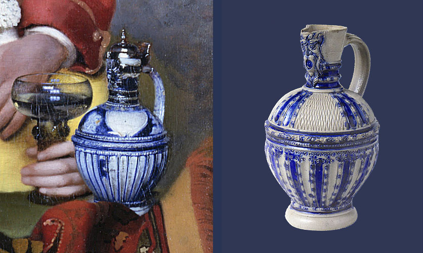 In de Koppelaarster in Dresden is rechts naast de jonge courtisane in het gele jakje een blauw-grijze wijnkan met tinnen deksel te zien. Het is een vroeg 17e eeuws type steengoed wijnkan, vervaardigd in het Rijnlandse pottenbakkerscentrum Raeren. De hals van de kan is versierd met een leeuwenmasceron. Later werd de productie voortgezet in het Rijnlandse Westerwald. Delftse pottenbakkers gingen dit type wijnkan met tinnen deksel later produceren in een geheel witte variant, die in meerdere latere schilderijen van Vermeer steeds weer opduikt. Deze in Delft geproduceerde variant is geïnspireerd op het witte Bianchi di Faenza vaatwerk uit het Italiaanse Faenza.