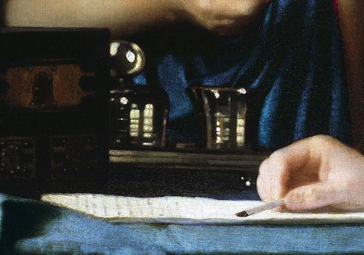 Vermeer besteedt altijd veel aandacht aan de keuze van de props en attributen op de tafel bij de mooie jonge vrouwen die hij schildert. Het zijn als het ware verlengstukken van haar eigen, intieme wereld. Een deel van haarzelf. Indirect vertellen ze een verhaal over haar intieme verborgen gevoelsleven, zonder het geheim ervan prijs te geven.