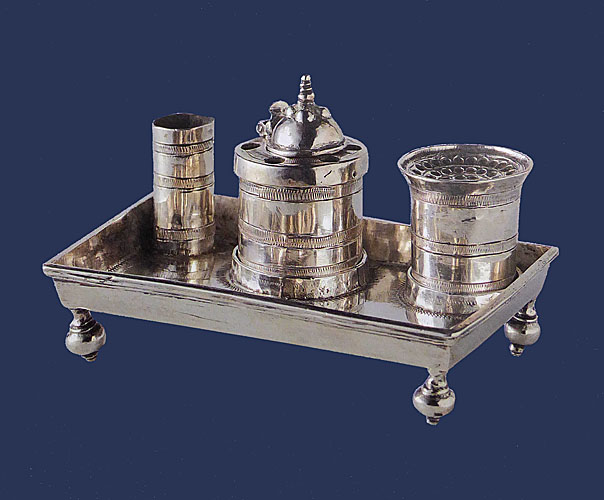 Een dergelijk zilveren inktstel is in twee Vermeer-schilderijen afgebeeld. Het meest prominent in Vermeer’s “Mistress and Maid” in de Frick Collection in New York en rechts aan de rand op de “Lady Writing a Letter with her Maid” in de National Gallery in Dublin.