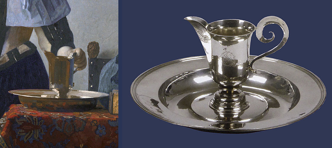 Op Vermeer’s “Young Woman with a Water Pitcher” uit 1662-64 is een (mogelijk vergulde) zilveren waterkan met wasbekken te zien, een lampetstel. Een vergelijkbaar exemplaar bevindt zich in de collectie van Museum De Lakenhal in Leiden.