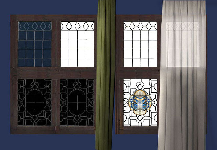 te zien, waarmee de onderste twee glas-in-lood raampanelen verduis-