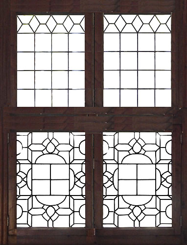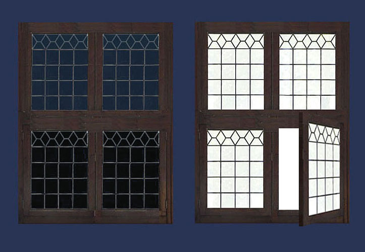 Met de buitenluiken konden de twee onderste glas-in-lood panelen gedeelte-