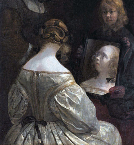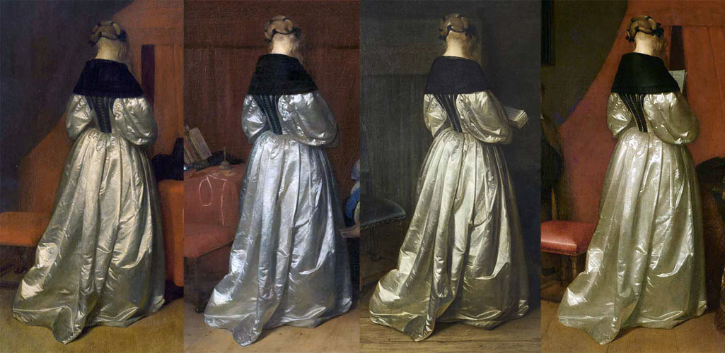 Vanwege de fenomenale stofuitdrukking van zijde en satijn in de kostuums van voorname dames kregen deze schilderijen van Gerard Ter Borch de bijnaam “Satijntjes”. Model voor deze op de rug geziene elegante figuur stond zonder twijfel zijn half-zus Gesina.